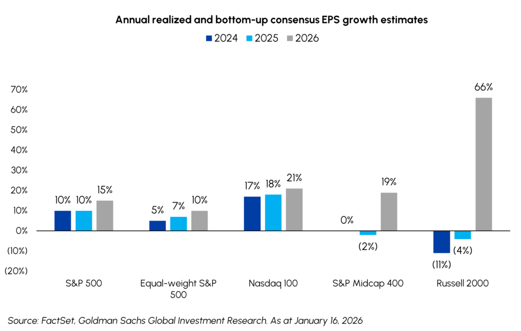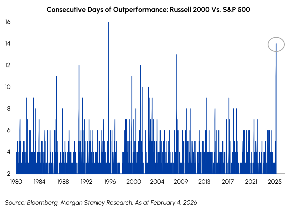 During January, the TSX was up 0.8% while the S&P 500 generated a respectable 1.4% return, with 7 of the 11 S&P 500 sectors outperforming the Index. Resource sectors led the way with Energy up 14.4% and Materials up 8.7% amidst rising commodity pricesThe market broadening theme we predicted at the start of the year has already started to play out in a meaningful way. More notable is the rotation into small and mid-cap stocksThe Russell 2000 generated a total return of 5.4% this month and included a 14day streak of outperformance relative to the S&P 500  the longest stretch dating back to 2016. While investors have rightly been focused on the AI boom for several quarters, we are now seeing encouraging signs of improving sentiment in other areas. We think the current setup has structural underpinnings of a sustained rally in ‘Non-Megacaps aided by monetary and fiscal stimuluseasing financial conditions, increasing M&A and accelerating earnings momentum