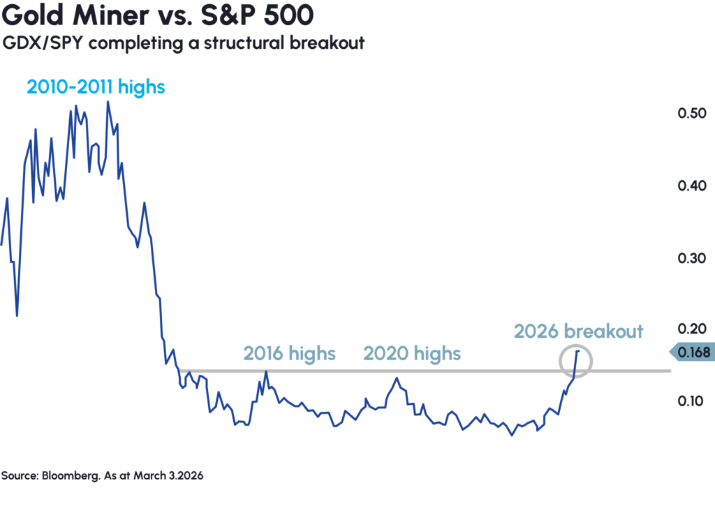 Gold and gold equities significantly outperformed broad North American markets in February with bullion and the S&P/TSX Gold Index up 8.5% and 23.6% respectively versus a negative 0.7% return for the S&P 500. Gold equities look to be breaking out of a sideways channel versus the S&P 500 as seen in the below graph. Traditional factors driving gold higher remain firmly in place, but we also note some key differences vs prior cycles that could extend its longevity, including central banks being major net buyers, erosion in international confidence and elevated global sovereign debt burdens. Since the 2022 cycle low, gold has appreciated an impressive 220% however history points to material upside. If the current cycle were to replicate previous bull cycles such as 1976-1980, 2001-2008 or 2001–2011, the implied price 2-3 years forward would extrapolate to between US$8,000-US$10,000/ an ounce. Despite ongoing producer discipline, strong balance sheets, record margins and free cashflow generalist investors remain underweight the gold equity sector. Capital allocation is beginning to reflect the shift in gold miners’ fortunes. Buybacks, dividend increases, and special dividends are recurring themes so far this year, signaling growing confidence in balance sheets and sustainability of cash flows. Will substantial M&A be next?