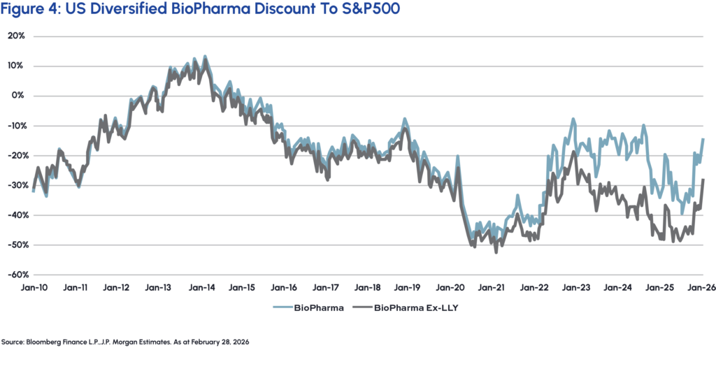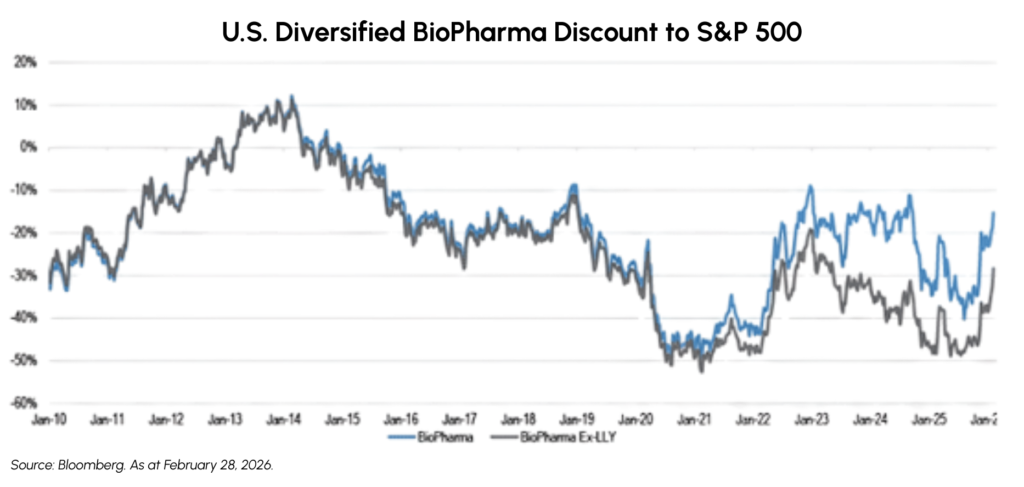 Healthcare benefited from broader market rotation with the S&P 500 Healthcare sector generating a total return of +3.5% during February. Beneath the surface, performance has bifurcated meaningfully, as Biopharma has outperformed on the back of resilient earnings, improving sentiment around pipeline productivity, and investor rotation back into more defensive growth pockets of the market while Life Science Tools & Services have come under pressure amid renewed concerns around AI-driven disruption.