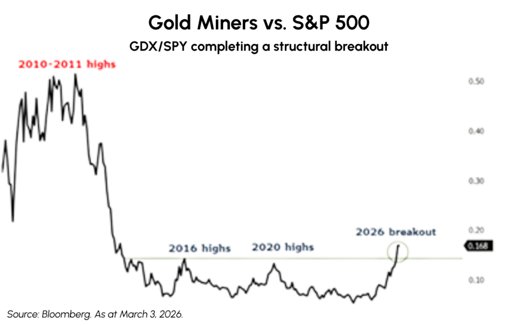 Gold and gold equities significantly outperformed broad North American markets in February with bullion and the S&P/TSX Gold Index up 8.5% and 23.6% respectively versus a negative 0.7% return for the S&P 500. Gold equities look to be breaking out of a sideways channel versus the S&P 500 as seen in the below graph. Traditional factors driving gold higher remain firmly in place, but we also note some key differences vs prior cycles that could extend its longevity, including central banks being major net buyers, erosion in international confidence and elevated global sovereign debt burdens. Since the 2022 cycle low, gold has appreciated an impressive 220% however history points to material upside. If the current cycle were to replicate previous bull cycles such as 1976-1980, 2001-2008 or 2001–2011, the implied price 2-3 years forward would extrapolate to between US$8,000-US$10,000/ an ounce. Despite ongoing producer discipline, strong balance sheets, record margins and free cashflow generalist investors remain underweight the gold equity sector. Capital allocation is beginning to reflect the shift in gold miners’ fortunes. Buybacks, dividend increases, and special dividends are recurring themes so far this year, signaling growing confidence in balance sheets and sustainability of cash flows. Will substantial M&A be next?